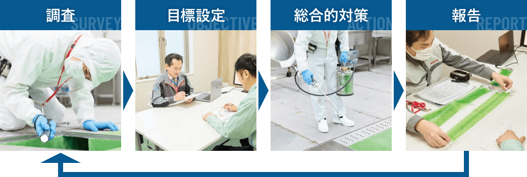 業界のパイオニアとして、健康と環境に考慮した効率的かつ効果的なリューションを工場、倉庫、ビル、公共施設、文化財、一般のご家庭など幅広い分野に対して防虫防鼠をはじめとした総合的有害生物管理をワンストップサービスでお届けします。