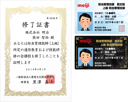 防虫管理技師に求められるこれらの役割は、認定証の裏面に明記され、所属する事業所の防虫管理を力強くけん引する自覚を促しています。