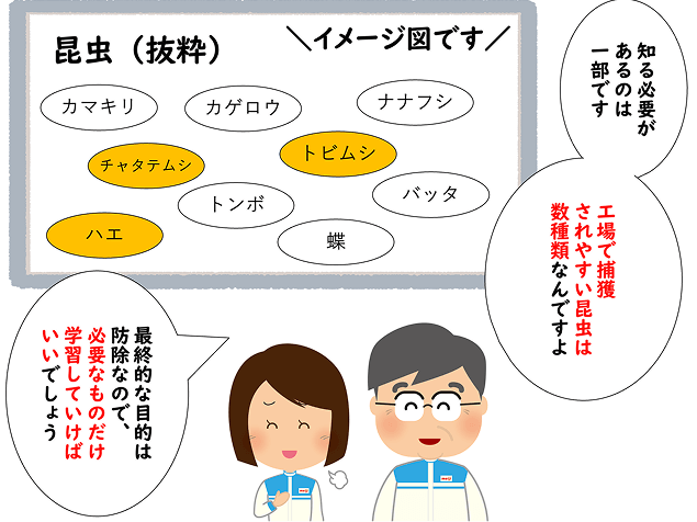 事業所によって防虫管理上の課題は異なります。たとえば、市乳工場では「湿潤環境を好む虫」、粉体・菓子工場では「貯穀害虫」が問題となります。こうした工場で問題となる虫に絞った教育カリキュラムが充実していること、デフォルメされたイラストで理解度を高める工夫があったこともご依頼した理由でした。