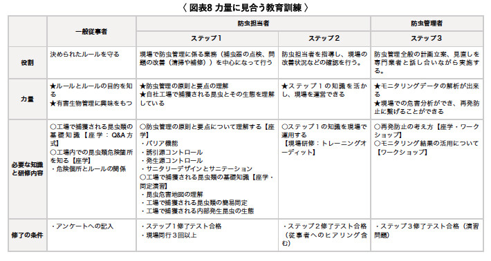 これまで述べてきたように昆虫類の防除システムの構築には、非常に多くの情報が必要である。工場の規模が大きくなれば、社内でこの情報を処理する管理者・責任者のエキスパート化も必要になると考える。この情報は大きく分けて2つあり、1つは昆虫類の生態や分類などの情報、もう1つは管理に関することである。この2つの情報を組織の知識・個人の能力に変換することが大事であり、その手段としての管理の意図にあわせた教育訓練システムを構築することが必要となる。両者の情報を踏まえた管理者向けの効果的な教育訓練には、実習や実演が含まれた内容が必要となるので、ワークショップ形式であることが望ましい。また、開催・企画にあたっては、状況に合わせ臨機応変に内容を変更することも念頭に置くべきである。一般の従事者には決めたルールを伝える教育が必要である。特に、実施による効果と意味を教え、なぜその頻度・内容でやるのかを理解させることが重要である。つまり、実施方法を詳しく教えるよりも、出来上がりの基準を明確にしてその根拠を伝えるべきである。ルールを変更した都度、これを実行することが重要である。最近では、防虫対策に関する教育をEラーニングで実施する企業が増え、時間と場所を問わず学習する環境が整いつつある。防虫対策は現場活動と密接していることから、教育の効果が製造の場で活かせるよう、管理者・責任者はEラーニングの内容と関連付けた教育と、検証活動を心がけたい。